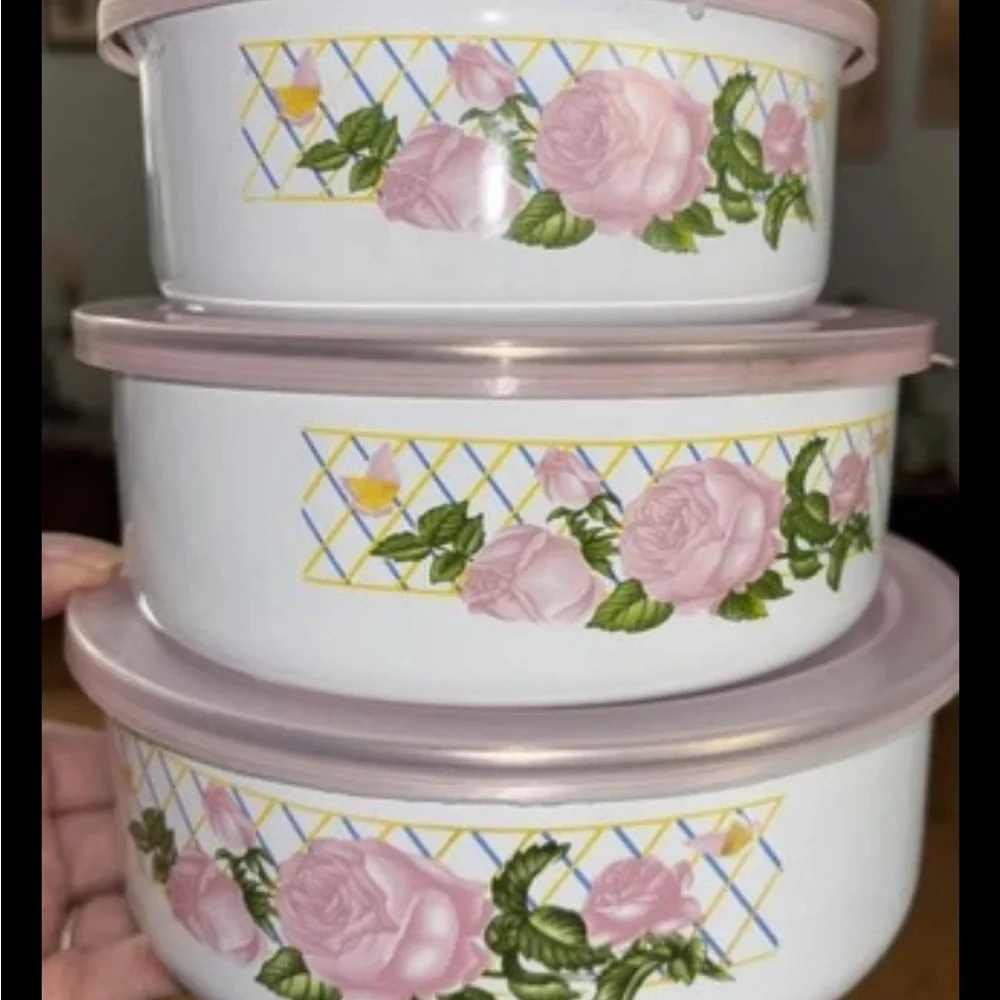 Elegant storage containers/lids with a beautiful floral design. Perfect for organizing your kitchen. Features a lovely pink and white color scheme. New old stock. Never been used. Comes with original box. See pics