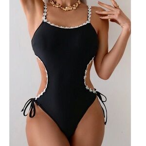 Floral Detail Cut out Side Tie Monokini One Piece Swimsuit