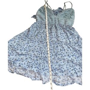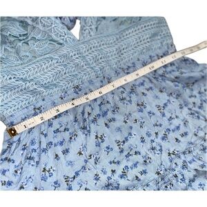 This flirty and feminine very mini dress is perfect for summer outings, festivals, or casual dates! Features a delicate lace bodice with adjustable spaghetti straps, smocked crochet waist, and a tiered ruffle skirt with an all-over dainty blue floral print. Back tie detail for a customizable fit.