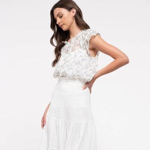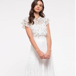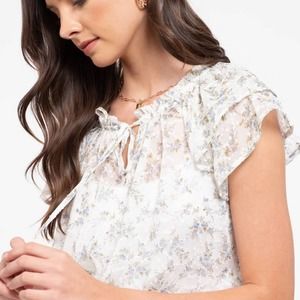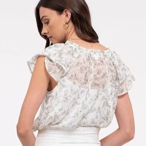 Beautiful lightweight and airy blouse in a pretty floral print. Dainty and feminine with a double ruffle sleeve. Gorgeous sheer top for spring and summer. Pair with your favorite skirt, shorts or jeans!