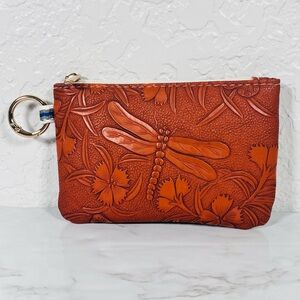 This stylish embossed faux leather coin bag features a gold tone ring and zipper top.