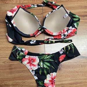 Bikini set with twisted top & bottom with draped sides. Bikini bottom is lined in the front and back