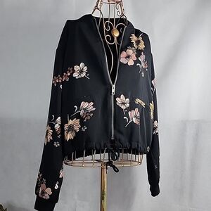 Super cute floral Bomber jacket with a lightweight feel, zippered close, satin lining, 2 faux front pockets and a braided drawstring at bottom hem