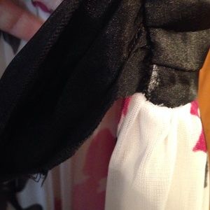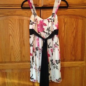 This Floral dress is white with pink and black accents. It is a juniors large, not a woman's size. Was bought and worn once. Could go more for a medium if you are big chested. As shown in the last picture, there is just a little tear on the very right side of where the cleavage would be. I didn't even notice this until I thoroughly examined this dress to list it. I'm a 36 C-D and I think my boobs are too big for this dress. No stains!