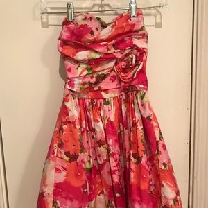 This fit and flare dress has boning and ruching on the top, many layers on the bottom, and a beautiful flower on the right side. Pink spaghetti straps were added, but this dress otherwise looks new! Only worn once.