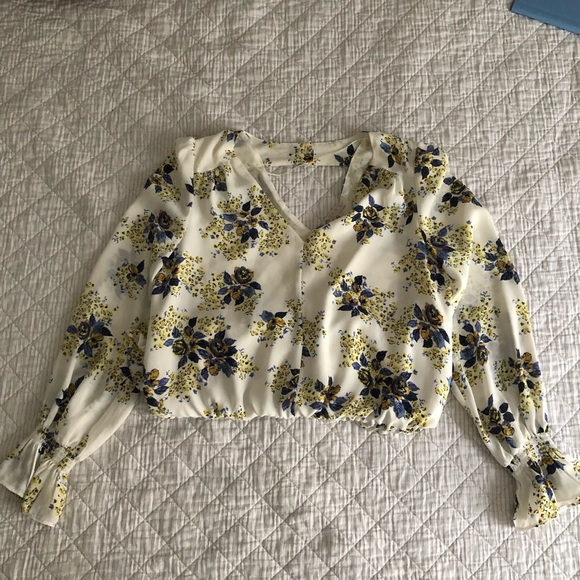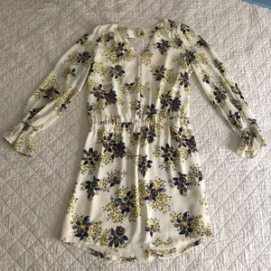 Floral dress Super cute v-neck dress with synched sleeves and stretchy waist Size- 8 Waist- 30-40” Chest- 38” Hips- 40” Length- 35”