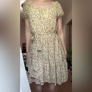 This is an off the shoulder dress. It has a ribbon that can tie in front or back, and has ruffles at the bottom.