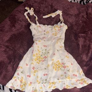 Elegant mini dress featuring a charming floral pattern. The dress showcases a white base with pink and yellow flowers, complemented by ruffle straps for a feminine touch.