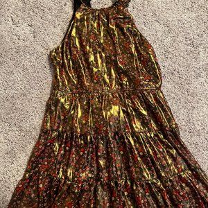 NEVER WORN, flowers, gold short mini dress, high neck, 100% Polyester,
