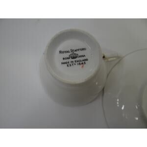 This is a beautiful Royal Stafford Bone China tea cup and saucer set. The pattern features the floral emblems of Canada. It is a lovely and collectible piece, perfect for tea lovers or anyone who appreciates fine china.