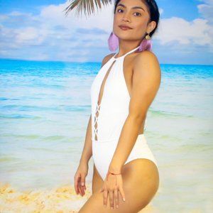 Beautiful and delicate, this lace up, halter swimsuit features a floral embossed texture for a flair of elegance