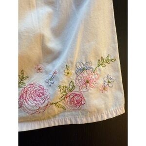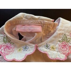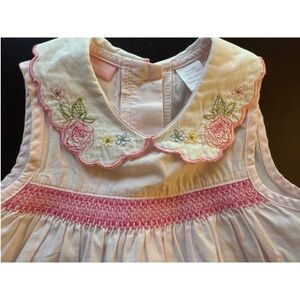 Adorable baby dress with floral embroidery. Features a charming collar and pink accents.
