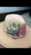 Stylish beige hat with vibrant floral embroidery. Features pink, purple, and green accents.