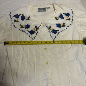 Charming blouse with vibrant blue and yellow floral embroidery. Features a scalloped collar. Vintage shirt some stains