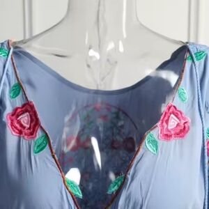 Embrace elegance with this blue maxi dress, featuring exquisite floral embroidery. Perfect for any occasion, its flowing design offers both comfort and style.