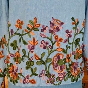 Chambray with colorful embroidered floral pattern on front, back and sleeves