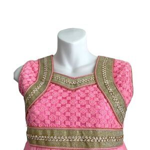 Bubblegum pink floral embroidered dress with gold embellishments and a cutout back, crafted from chiffon. Features an unusual sweetheart neckline, gold embellished trim outlining the top bodice, neckline, waistband, and hem. The gold trim has a swirled design on a shimmering textile. Pink embroidered flowers are set upon a mesh chiffon-like fabric, extending past the front gold trim. Sleeveless with an empire waist creating a babydoll silhouette. Gold beaded embellishments accent the waist. The skirt is made of pink mesh chiffon in an A-line shape, finished with more gold trim at the hem. The back is solid pink with a cutout at the top, secured by two ties, along with a waist tie and back zipper closure. Fully lined at the skirt. Good condition with minor fraying on the tie ends (see photos).