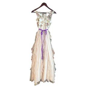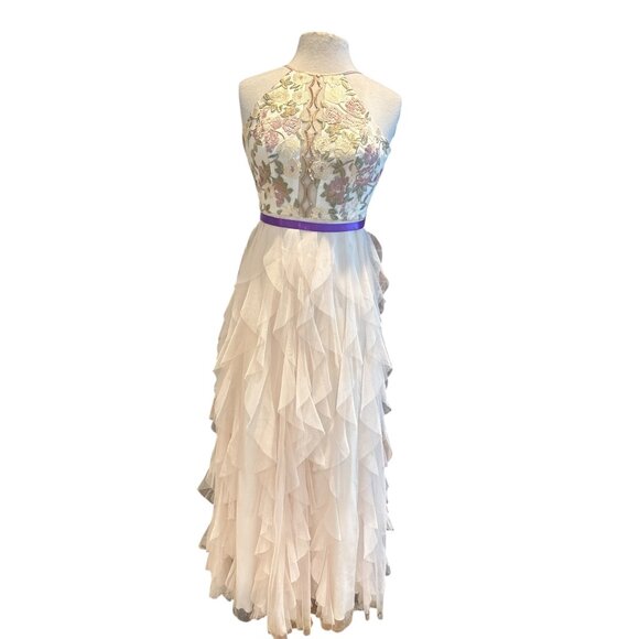 Floral Embroidered Halter Maxi Dress With Ruffled Tulle Skirt & Purple Waist Tie