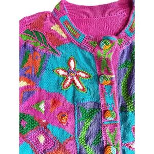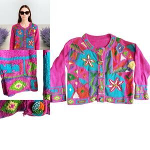 Stand out with this vibrant vintage hand-knit sweater cardigan featuring an eclectic mix of bold florals, geometric motifs, and artistic embroidery . A true one-of-a-kind statement piece, it’s adorned with beaded buttons and intricate detailing throughout. The thick knit and cropped silhouette give it a charming boho-folk vibe reminiscent of 80s-90s artisan wear.