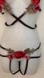 Strappy lingerie set with floral embroidery. Features red rose details. Black straps for a bold look.