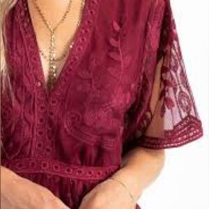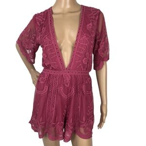 Chic romper with floral embroidery. Features a deep V-neck and sheer sleeves. Raspberry pink. Built in undershorts. Perfect for elegant occasions.