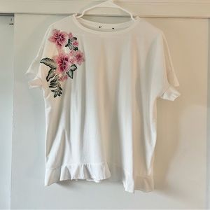 White blouse tee with ruffle hem and sleeves and pink floral embroidered detailing on one side. Oversized boxy fit. Unsure of size and brand because the tag has been removed! Very mild pilling.