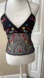 Chic black halter top with colorful floral embroidery. Sheer design adds elegance.