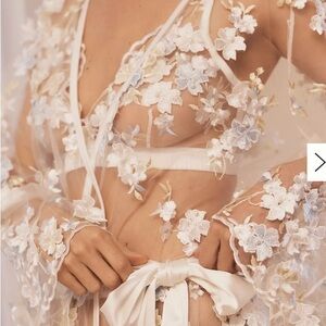Anthropologie short sheer robe featuring intricate floral embroidery in a soft cream hue. A perfect addition to your bridal collection.