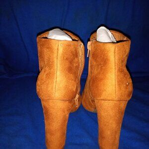 COGNAC / Charm with these floral embroidered ankle boots featuring peep toe opening, half moon block heel, above ankle shaft, faux suede upper, metallic thread stitching and side zipper closure.