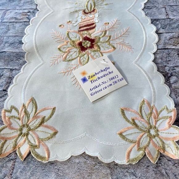 New never used table runner with pretty floral embroidery. Scalloped edge design.