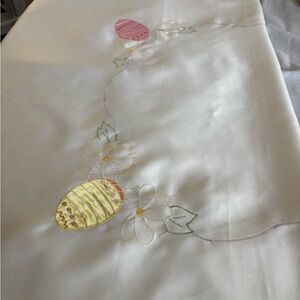 Elegant tablecloth with colorful eggs and flowers. Features pink, yellow, and purple eggs and flowers with green leaves.