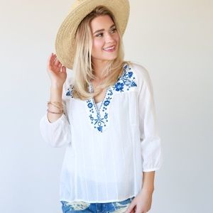 100% Cotton. This half sleeve top has a floral Embroidered v neckline and semi sheer fabric. Runs true to size