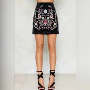 Say no more. This Eli skirt comes in velvet and features a zip closure, high-waisted, mini silhouette, and multicolored floral embroidery at front.