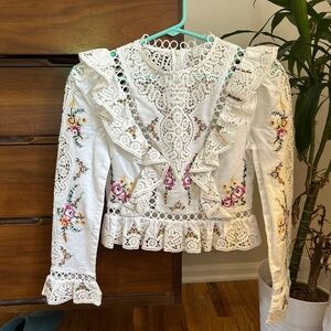 Elegant white lace top with floral embroidery. Features intricate lace detailing and a stylish design. Perfect for adding a touch of sophistication to any outfit.