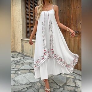 Elegant white maxi dress with floral embroidery. Perfect for summer occasions. 95% polyester, 5% elastane.