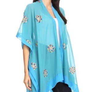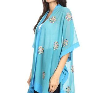 Sheer kimono with a monochromatic trim and floral feminine floral embroidery, side slits.