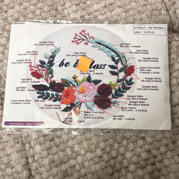 Colorful floral embroidery pattern kit. Includes detailed stitch guide and thread. Be bad as$ is the print and flowers surrounding. Never been opened. This is counted Crosstitch.
