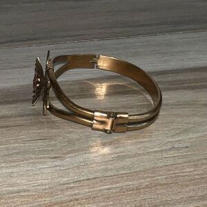 Floral Etched Clasp Bangle Bracelet Red Bead Brass Tone Classic Core Bohemian