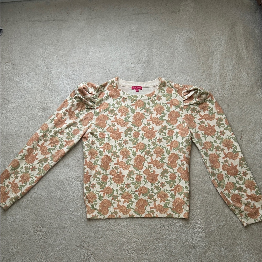 Super soft transitional sweater with puffed sleeves. Exquisite pattern of muted rust flowers with sage green leaves. EUC, worn only once or twice. Generous cut, feels like a dream.