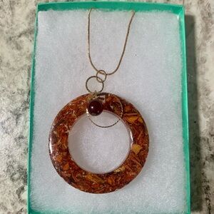 • (1) Floral preservation pendant necklace with amber bead, 2.5” L x 2.5” W