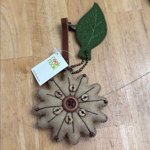 Charming floral felt keychain with a brown leather strap and green leaf accent. Perfect for adding a touch of nature to your accessories.