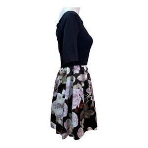 A charming fit and flare dress, styled with a navy bodice and a floral skirt. The dress features a flattering square neckline and three-quarter sleeves. The skirt showcases a beautiful rose print in shades of pink and mauve against a black backdrop, creating a visually striking contrast. It is designed with a classic fit and flare silhouette that accentuates the waist and flows gracefully.