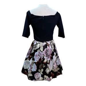 Keywords: fit and flare dress, floral dress, black bodice, rose print skirt, cocktail dress, party dress, womens dress, square neckline, 3/4 sleeve dress, pink rose dress, occasion dress, special occasion