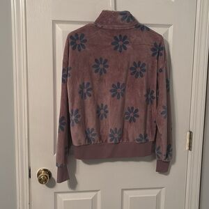 Cozy fleece pullover with floral design. Features a mauve base with blue flowers. Perfect for casual wear. 100% Polyester