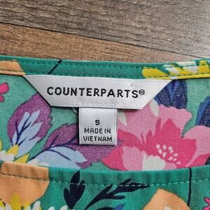 Vibrant floral top by Counterparts with a green base. Features pink, yellow, and white flowers.