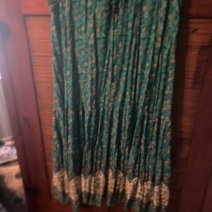 Charming green maxi dress with floral pattern. Features short sleeves and a flowy design.This is a freestyle dress with a tie on the upper breast area for more definition,Flowy short sleeves . New only worn once clean stored and forgotten. Perfect dress for Church and special occasions. Great looking with Cowboy boots!
