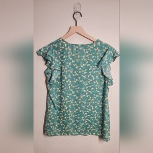 Embrace elegance with this floral green top featuring charming ruffle sleeves. Perfect for any occasion.