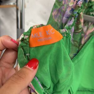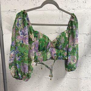 Floral Green Puff Sleeve Long Sleeve Crop Top - Open Back Ties - Size Medium
