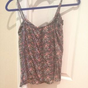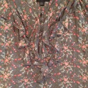 This grey floral tank is one of the softest shirts! It has ruffles in the front and a few buttons down the front. Only worn three times! Let me know if you have any questions please!!(: