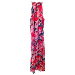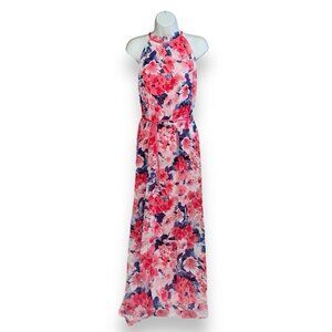 Add a burst of color and charm to your wardrobe with this gorgeous floral halter maxi dress in size 6. The dress features a stunning pink, blue, and white floral print on lightweight chiffon fabric, fully lined for comfort. The flattering halter neckline and belted waist enhance your silhouette, making it perfect for weddings, garden parties, vacations, or brunch with friends. This vibrant and breezy dress is ideal for spring and summer occasions. Pair with wedges or strappy sandals for a chic, polished look.